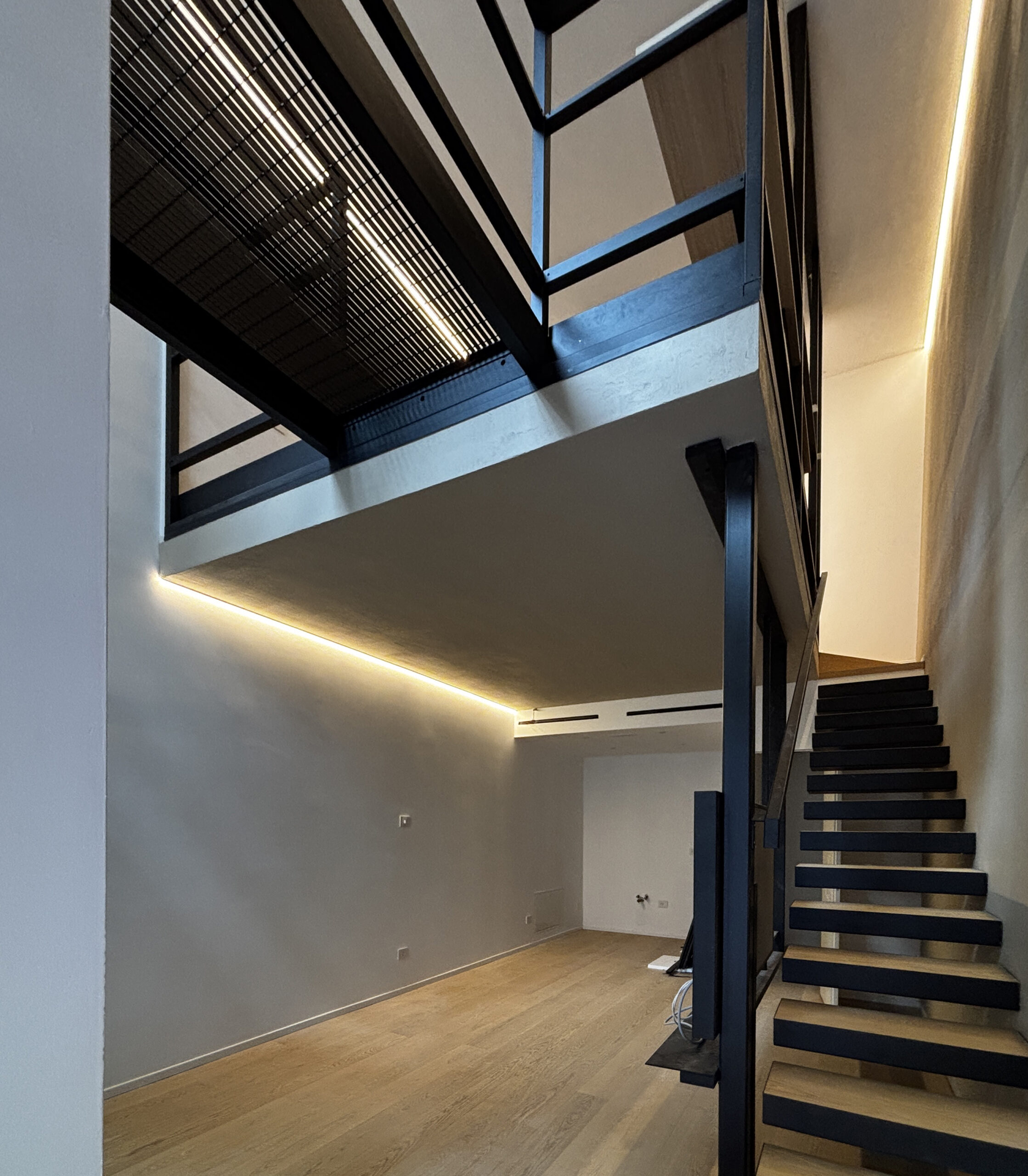Le scale in ferro e le pareti in cemento, definiscono la personalità dell'Urban Loft con uno stile industriale, incarnando l’essenza della vita metropolitana.